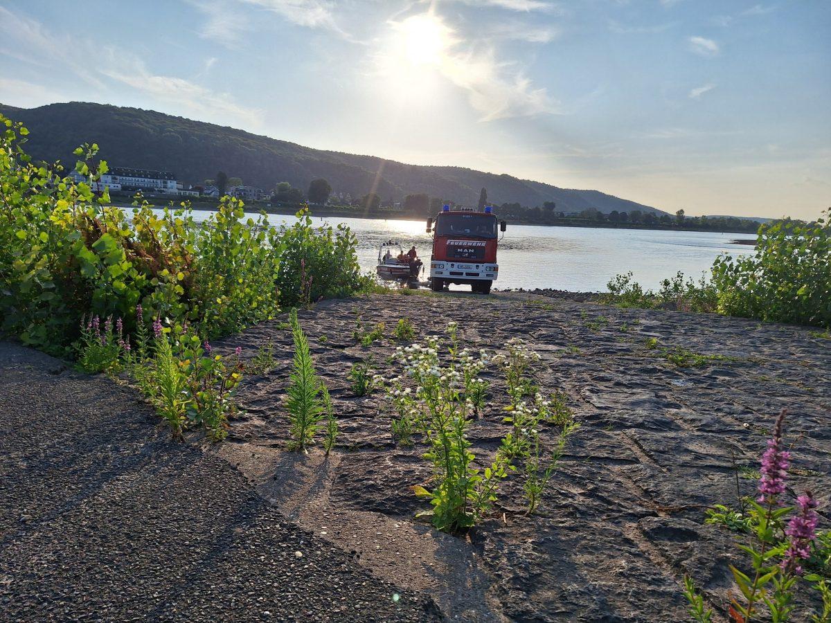 Während sich links- und rechtsrheinisch mehrere Boote auf den Weg zur Unfallstelle bei Rheinkilometer 613 (Höhe Ortseingang Leutesdorf) machten, konnte Einsatzleiter Michael Scharrenbach dort mehrere Personen an Land antreffen. Auch das gekenterte Boot wurde von den Personen zwischen den Bäumen festgehalten.